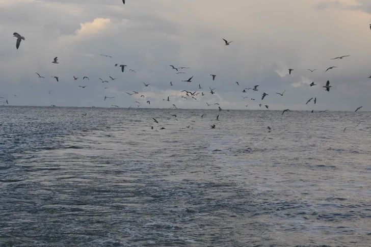 En dan dondert er opnieuw een stem over het dek, deze keer met een dreigende boodschap: ‘Jager!’ Dat is nog heel algemeen, want dan is het nog even goed kijken naar de precieze soort, in dit geval geen kleine of middelste, maar een grote jager. Hij mengt zich met kracht onder de meeuwen om zijn deel van de vis op te eisen.