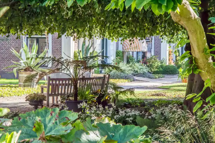 Wat een heerlijke tuin! Elementen uit verschillende tuinstijlen zijn op een mooie manier, met respect, met elkaar verenigd. Formele elementen, zoals een strak buxuslabyrint – een hommage aan de Leeuwarder renaissancekunstenaar Vredeman de Vries – worden afgewisseld met golvende lijnen van paden, gazon en weelderige bloembedden. Op strategische plekken staan houten banken en zitjes en overal zie je potten met exotische planten. Sommige van die potten en bakken moeten al heel oud zijn, want ze zijn aan één kant helemaal bemost. Een paar tuinhuizen geven beschutting en schaduw. En dan die eeuwenoude bomen: wat een sfeer hangt daar omheen. Je voelt en ziet aan alles dat hier met aandacht en vakmanschap getuinierd wordt.