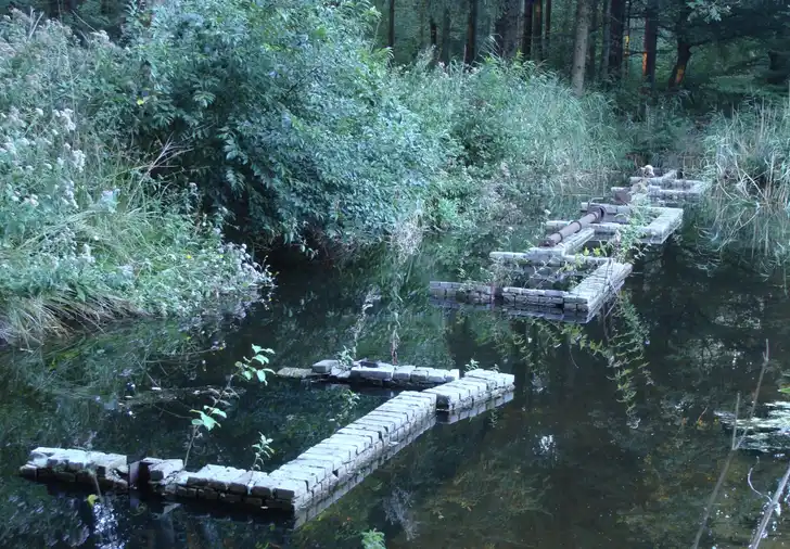 Mosgroene stroomgoten zijn nog een dankbare gastheer van water. Net als roestbruine ruïnes, overwoekerd door groen. Daarlangs stroomt het, altijd. Want het water is overal. Nog steeds. Het sist en het fluistert, het sijpelt en lispelt langs halfvergane muren en sluizen die al lang geen dienst meer doen. De schaalmodellen – ooit telde dit bos er wel zestig – zijn in onbruik geraakt, maar kregen een andere betekenis.