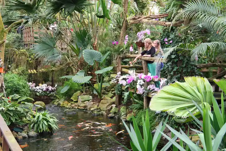 Het tropisch imperium in Luttelgeest kreeg gestalte met de orchidee. Uit Indonesië, Australië, Madagaskar, van de Himalaya. Ze hebben zo’n 1000 soorten in huis die moeten worden gekweekt, verpot en opgebonden. In de Orchideeëntuin, die eigenlijk meer weg heeft van een dichte groene jungle, wandel je via kronkelpaadjes en bruggetjes langs bananenbomen met gigantische bladeren, boomstammen en humusrijke takken waaraan de orchideeën (maar ook andere tropische bloemen en planten) zich hebben vastgeklemd voor een slimme “lift” naar het licht. In die jungle kabbelt een klein riviertje waar schildpadden wat tegen de oeverranden zonnebaden en koikarpers onvermoeid hun rondjes zwemmen. Ook klimatologisch waan je je in de Tropen: de luchtvochtigheid ligt er rond de 70 procent.