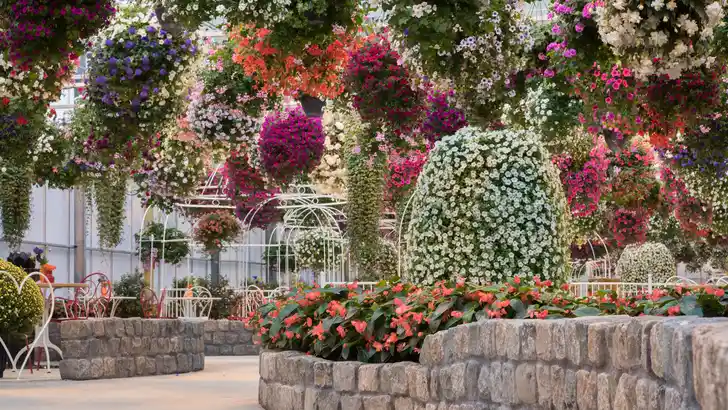 In deze sferen heb je weinig verbeeldingskracht nodig. Denk: een willekeurig terrasje in Toscane. Romantische prieeltjes, zacht geroezemoes, klaterende watertjes, klinkerstenen waarop tafeltjes zijn geschikt voor glazen Chianti en borden vol antipasti. Daarboven een veelkleurige explosie van bloemen tot zover het oog reikt.