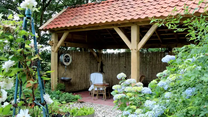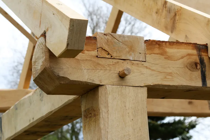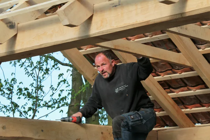 Als zzp’er richtte Rik zich helemaal op ambachtelijk timmerwerk, van monumentale gebinten voor de restauratie van een historische boerderij tot tuinhuizen of -meubels met een robuuste uitstraling. ‘Alle onderdelen voor een bouwwerk worden in mijn werkplaats op maat gemaakt en in elkaar gepast, nog zonder de toognagels, de houten pennen. Als het past, haal ik alles weer uit elkaar en nummer ik de onderdelen. Met een stift op een plek waar je er later niets meer van ziet, of ik sla met de beitel Romeinse cijfers in het hout. Op locatie wordt het als een bouwpakketje weer in elkaar gezet. En als ik het goed heb gedaan, dan past het precies!’