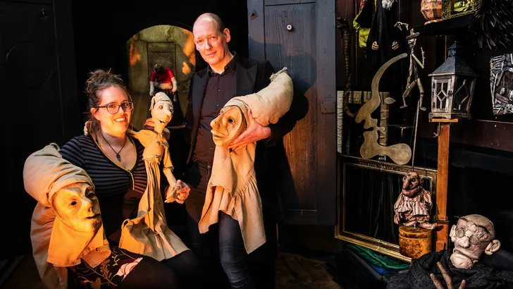 De metamorfose is verbluffend, show na show. Zodra ze in hun kostuums stappen, de rekwisieten oppakken en handgemaakte maskers over het gezicht trekken, slokt de magie van het spel de spelers op. Het figurentheater lijkt tot leven te komen. Jeroen en Laura Boerwinkel wórden hun masker.