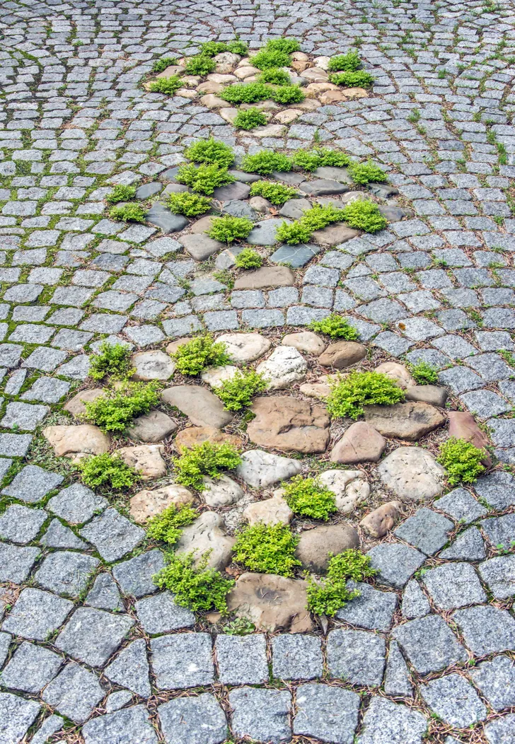 Deze fantasievolle bestrating ligt op onze oprit. Tussen de veldkeitjes heb ik een laagblijvende tijm (Thymus vulgaris ‘Compactum’) gezet. Ik hoop dat dit plantje mettertijd de voegen op gaat vullen, want ze houdt wel van zo’n warm en droog plekje. Tijm geurt lekker als het aangeraakt wordt, en de bloemetjes lokken veel insecten.