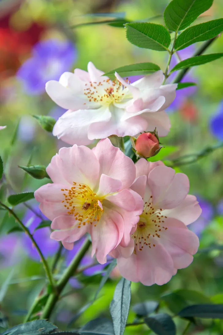 Dit verleidelijke roosje heet 'Open Arms'. Ze begint zalmkleurig en verbloeit naar lichtroze. Het is een kleine rambler (klimroos) die tot