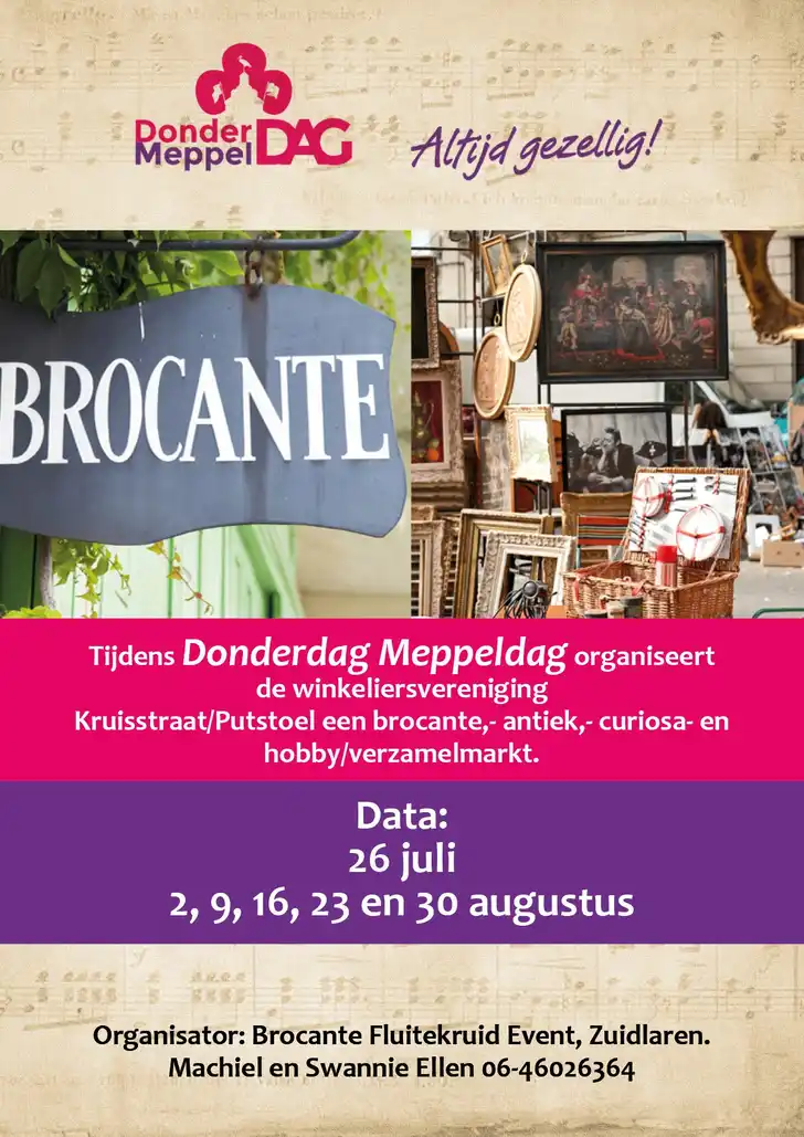 Tijdens Donderdag Meppeldag organiseert de winkeliersvereniging Kruisstraat/Putstoel een Brocante, Antiek, Curiosa en Hobby/verzamelmarkt. De data zijn 26 juli en 2, 9, 16 , 23 en 30 augustus.