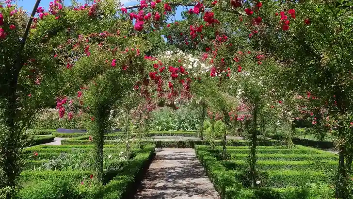 De bloeiende rozentunnel in de tuin van de Menkemaborg in Uithuizen is een jaarlijkse publiekstrekker. De bloei van de rozen is dit jaar uitzonderlijk vroeg begonnen. Het prachtige warme weer heeft gezorgd voor een prachtig bloeiende rozentunnel. Wandelen door een tunnel van roze, rode en witte rozen is een bijzondere ervaring. Maak een rondje door de tuin met de strak geschoren hagen en geniet van de bloeiende rozen en bloemen in de siertuin van de Menkemaborg.