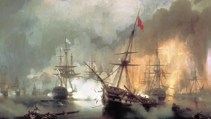 Tekst: Noordelijk Scheepvaartmuseum | Foto: Schip de Azov bij de Slag bij Navarino, schilderij door Ivan Konstantinovich Ayvazovsky, jaartal onbekend.
