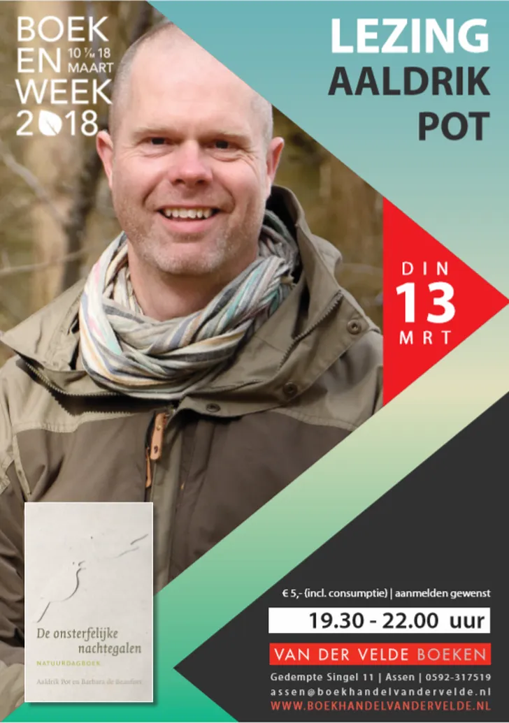 In het kader van de Boekenweek geeft Aaldrik Pot in onze winkel in Assen op dinsdagavond 13 maart van 19.30 - 22.00 uur een lezing over zijn recent verschenen boek De onsterfelijke nachtegalen. Een Natuurdagboek.
