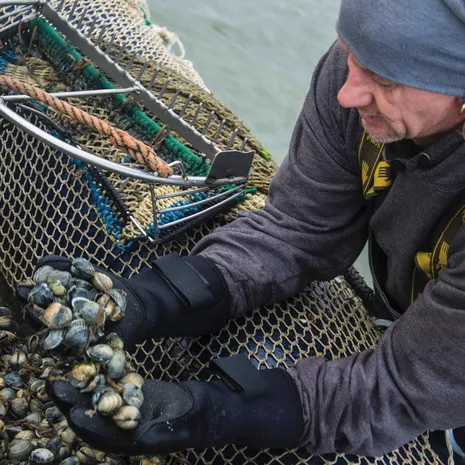 De gevangen kokkels worden in een groter net geschept dat op een opblaasboot ligt. ‘Ik kan vissen tot het water te ver is gezakt. Dan moet ik een poosje wachten tot de vloed weer opkomt en kan er weer een tijd gevist worden.’ Voordat het water te hoog komt, trekt Richard alle opblaasboten naar het schip en hijst de vangst aan boord. En dan is het weer geduldig wachten op het volgende tij.