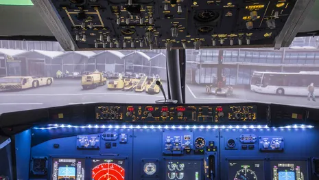 Bij een hoogte van 600 meter klinkt de bekende ping, die ook in echte vliegtuigen hoorbaar is. ‘Dat is de Outer Marker, die de afstand tot het vliegveld aangeeft.’ Zacht fluiten de motoren. De apparatuur, die verbonden is met acht computers, produceert een droge warmte.