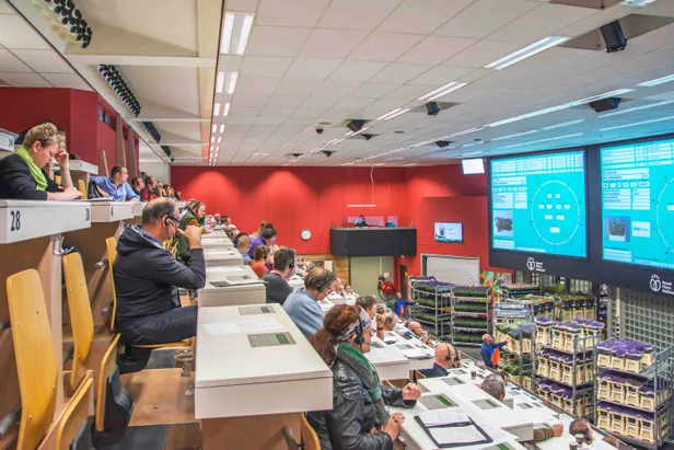 De afmijnzaal heeft wel iets van een collegeklas. Marktkooplui, winkeliers, inkopers en grossiers zitten op een tribune aan tafeltjes van twee, hun koptelefoons op voor de meldingen van de veilingmeester. Wie kans wil maken op het beste en mooiste aanbod van de dag moet vroeg uit de veren: half zeven sharp start de klok. Vier dagen in de week. In het zicht van de kopers worden karren vol verse waar geshowd: een ware zee aan bloemen paradeert in rap tempo voorbij. Een hommage aan het groeiseizoen, met het aroma van een zojuist beregend tuintje. Fris en fleurig, één bloeiende oase. Hoe het werkt? Ja, dat is voor de meesten natuurlijk een weet in deze zaal. Maar voor debutanten die een kijkje mogen nemen is het vooral een geheimzinnig gebeuren dat zich volgens onbekende codes en spelregels voltrekt. Gelukkig hebben wij communicatie-