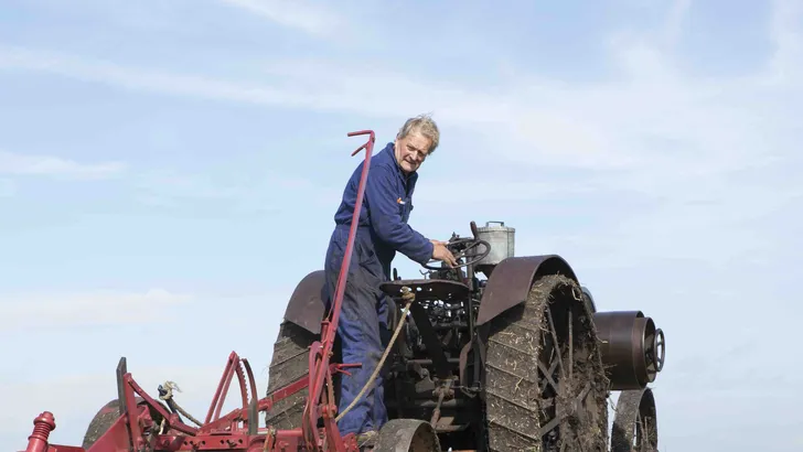 Eerke Leeuwerik (71), Jan Eerkens (62) en Gerrit Jan Vrieling (65) behoren tot de groep liefhebbers die van het besturen van oude trekkers met scherpe ploegen hun hobby hebben gemaakt. Daar komt Eerke Leeuwerik. Stomend en ploffend rijdt hij over de akker op een machine die associaties oproept met een oude stoomlocomotief. Zijn van oorsprong Canadese trekker is gebouwd in 1917. Puur en ruig komt hij over, met stevige ijzeren constructies en aandrijfassen die de oerkrachten in goede banen moeten leiden. Vanuit de boerenschuur reed deze machine op ijzeren wielen destijds meteen de akkers op. Tegenwoordig staat hij in Veendam gestald en wordt tijdens het ploegseizoen altijd weer wakker geschud door Leeuwerik. Hij doet dit altijd graag en met liefde. ‘Het is de techniek en het oude. Dat is mijn passie. Zeker deze trekker - die is gebouwd in de stoomtijd – vind ik prachtig,’ vertelt Leeuwerik over zijn hobby. En geef hem eens ongelijk.