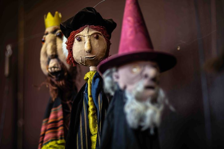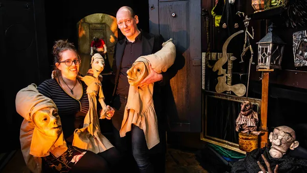 De metamorfose is verbluffend, show na show. Zodra ze in hun kostuums stappen, de rekwisieten oppakken en handgemaakte maskers over het gezicht trekken, slokt de magie van het spel de spelers op. Het figurentheater lijkt tot leven te komen. Jeroen en Laura Boerwinkel wórden hun masker.