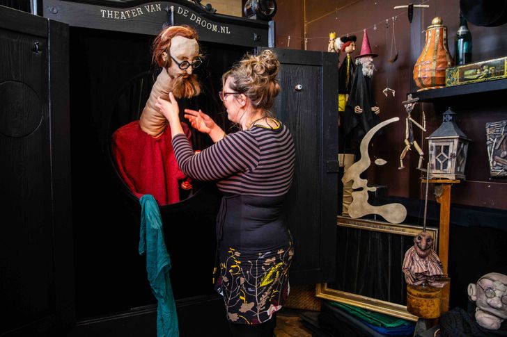Het is hoogstaande kunst, maar dan zonder drempels. De aanstekelijke voorstellingen van mime-, marionetten- en poppenspelers Jeroen (50) en Laura Boerwinkel (34) uit Meppel zijn subtiel, met oog voor detail gemaakt en toch geschikt voor alle leeftijden. In de acts van hun eigen Theater van de Droom wordt geen onderscheid gemaakt in hooggeëerd publiek, de krachtige beeldentaal is universeel. Herkenbaar. ‘Als je goed in je rol zit straal je dat uit. Dan gebéurt er iets,’ zegt Jeroen. ‘Het is magisch om te zien hoe zowel een kind, z’n ouders als grootouders geboeid naar ons zitten kijken. Als mensen het toelaten proberen we ze met ons spel te vangen, mee te voeren. Dan stappen ze even in een andere wereld.’