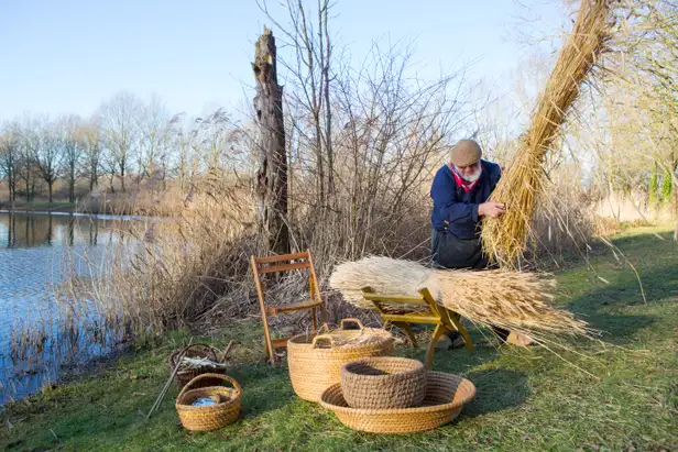 Rob is korfvlechter en imker bij De Schokkerbij en geeft regelmatig demonstraties korfvlechten op het Werelderfgoed Schokland. Nu en dan komen bezoekers Restaurant Schokland binnen. De winterkou hangt nog in hun jassen. Met bewondering bekijken ze gevlochten korven. ‘Voel eens hoe zwaar zo’n korf is,’ zegt Rob. ‘Duurzaam en onverslijtbaar.’