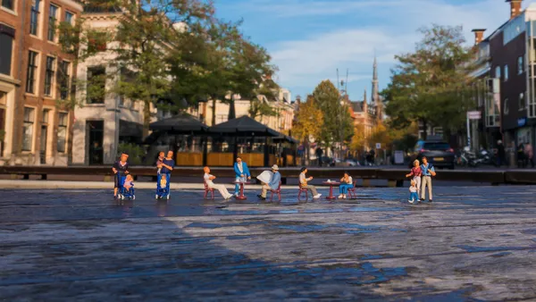 Languit ligt Michel Tilma (50) op zijn buik voor een putdeksel op het Oldehoofsterkerkhof in Leeuwarden. Geconcentreerd tuurt hij door zijn fotocamera, één oog toegeknepen. Voor zijn neus een plukje gras en een plas water. Hoog boven hem de scheve, kromme Oldehove. Verbaasd slaan passanten hem gade. Wat doet die man daar op de grond? Sommigen stoppen en vragen het hem. Pas als Michel wijst op de miniatuurpoppetjes die samen picknicken in het gras, zien ze waar het om gaat. Het is een van de 55 miniatuurtaferelen die Michel in Leeuwarden heeft neergezet. Een routekaart brengt wandelaars langs al zijn creaties. Die variëren van backpackers, werklieden en straatmuzikanten tot een tuinman, mountainbikers, spelende kinderen en een accordeonspeler. Nadat Michel de poppetjes heeft geplaatst, maakt hij er een foto van en plaatst die op zijn website en op Facebook.