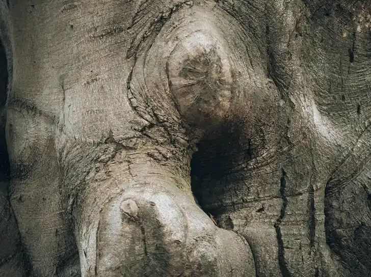 Aan diezelfde Baekendyk staan nog vier andere eeuwenoude beuken – “veteranen” – met sprookjesachtige knoesten en holtes waarin je met wat fantasie een oog, een kinderhoofdje of een mythisch dier zou kunnen herkennen. Op de achtergrond, als lakeien in het gelid, rijen Douglassparren. Laag, gefilterd herfstlicht tussen de stammen. De stilte is er zo diep dat je opschrikt van een krakende tak, een windvlaag door de bladeren, het zachte plofje van een vallende eikel.