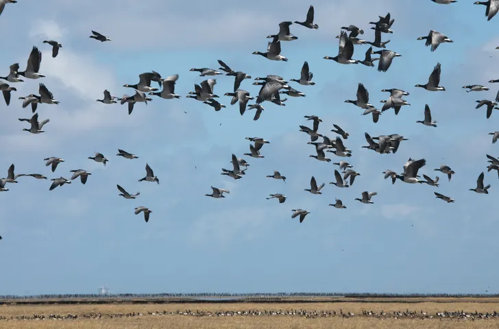 Niets van het gemoedelijke geroezemoes op het terras is nog hoorbaar als je de zeedijk beklimt, de kwelder op gaat en een overweldigende rust je tegemoet treedt. De kleine getijdenhaven ligt nagenoeg droog. Vogels zingen, ganzen gakken. Nu en dan de zoemende spaken van een fietser op de dijk. Een mozaïek van gebarsten klei op de slikgronden, hier en daar plukken droog gras.