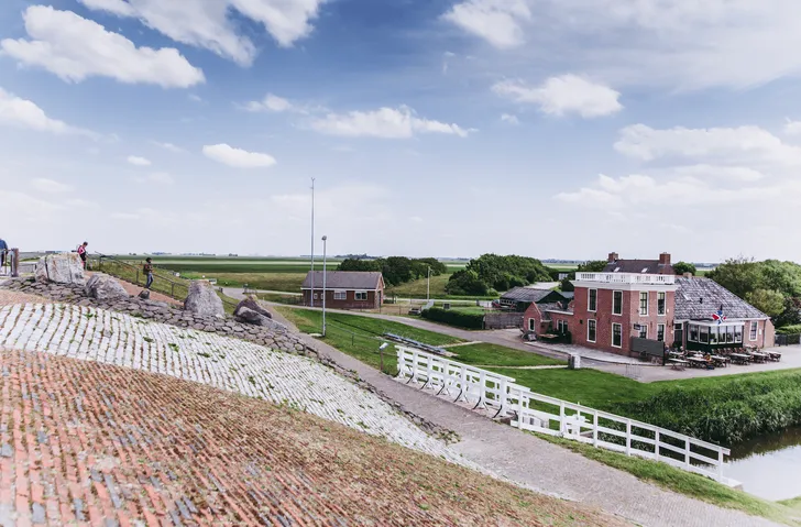 In de verte verschijnen op de dijk, als op een bordes zonder publiek, steeds nieuwe figuurtjes, zwart afgetekend in het tegenlicht. Hun stemmen dragen ver. ‘Meestal is het hondenweer, maar nu kun je hier gewoon staan,’ zegt Harm Smit uit Groningen, die samen met een vriend een tochtje met de racefiets maakt. Met het frame op zijn schouder daalt hij de trap af naar beneden, waar de frituurgeur lonkt. ‘Een bier en een portie bitterballen gaat er wel in. Die fietsen we er dadelijk wel weer af.’