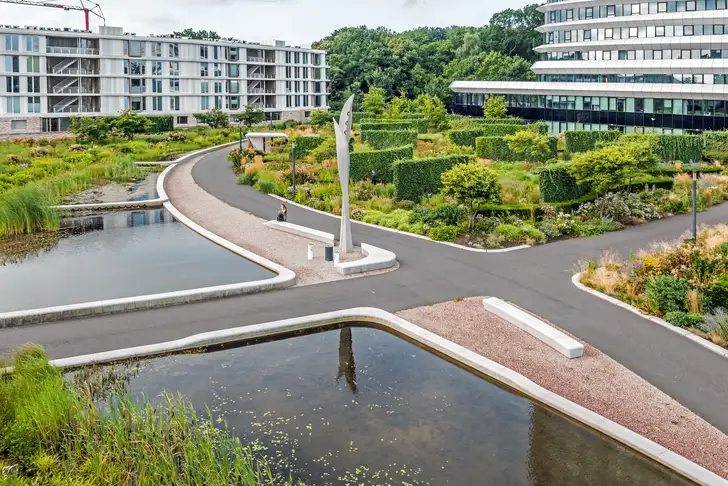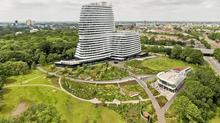 Deze enorme stads- en daktuin ligt aan de voet van de Kempkensberg, een kantorencomplex in Groningen waar DUO en de Belastingdienst gehuisvest zijn. Het gebouw wordt door zijn opvallende asymmetrische constructie en grootte – maar liefst 92 meter hoog – weleens gekscherend “het cruiseschip” genoemd.