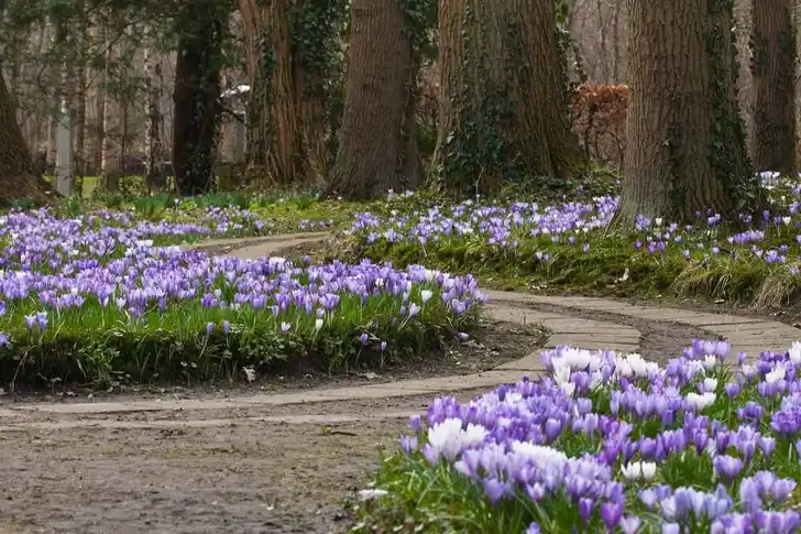 Natuurlijk sta je ook stil bij de vele krokussen die in bloei staan. De hele tuin kleurt hierdoor paars en wit: een bijzonder decor om doorheen te wandelen.