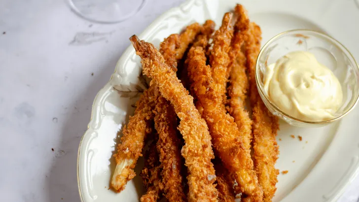- Verwarm een laagje zonnebloemolie in een braadpan en frituur de asperges per drie om en om goudbruin en krokant. Laat de asperges daarna goed uitlekken, bijvoorbeeld op keukenpapier, en serveer ze vervolgens met het sausje.