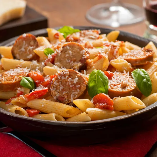 - Meng de pasta met de groenten en worst. Schep dit vervolgens in een ovenschaal. Strooi hier nog de geraspte kaas overheen.