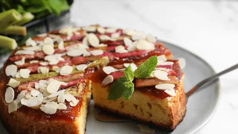 - Verdeel het beslag over de springvorm en verdeel de stukjes rabarber over de bovenkant met een snufje suiker en amandelschaafsel. Bak dit in 45 minuten af totdat de cake gaar en goudbruin is.
