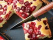 - Snijd de cake horizontaal doormidden. Leg het bovenste deel apart en verdeel de rabarber compote over de cake. Plaats het bovenste deel daarna terug op de cake.