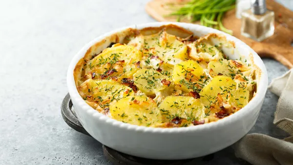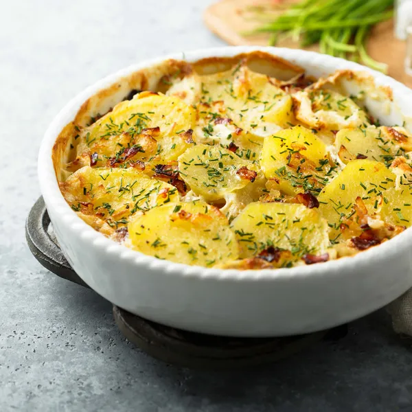 - Bak de aardappelgratin voor ongeveer een uur in de oven totdat de aardappels goudbruin en gaar zijn. Laat de gratin dan nog 10 minuten afkoelen voordat je 'm serveert.