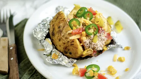 - Als de aardappel gaar is, kun je er gemakkelijk met een mesje doorheen snijden. Vul de aardappel met de tonijnsalade, top af met in ringen gesneden jalapeño peper, de overige tomaat, augurk en geraspte kaas. Eet ‘m samen met de maiskolf.