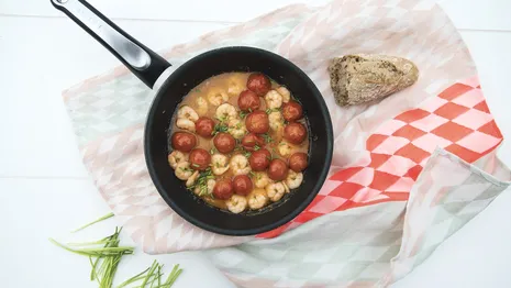 - Doe alles in een koekenpan en voeg vervolgens de witte wijn, paprikapoeder en de cherrytomaten toe. Verwarm alles goed.