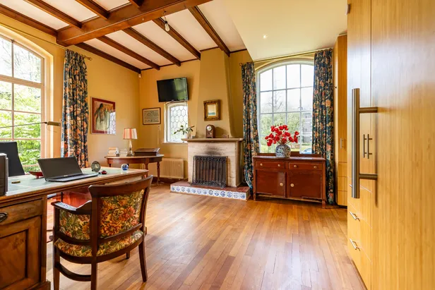 In de werkkamer is goed te zien dat het huis is gemoderniseerd, maar dat er tegelijkertijd authentieke details bewaard zijn gebleven. De muren en kastenwand zijn strak, en toch brengen de betegelde haard en het balkenplafond sfeer in de kamer. Welk detail vind jij het gezelligst: de fleurige gordijnen of de verse bloemen op het kastje?