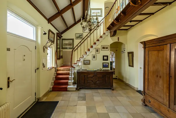 Kom met ons mee naar binnen, waar een indrukwekkende entree gelijk tot de verbeelding spreekt. Het doet ons denken aan een jachthuis met de houten details, de robuuste meubels, de grote trap en de vide die uitkijkt over de hal. Een leuk detail: de tegelvloer is nog origineel en komt uit de jaren 30, toen het huis werd gebouwd.