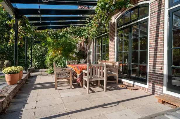 Bij het huis hoort ook een mooi buitenterras mét glazen overkapping. Zo met het zonnetje, de druivenranken en de terracotta-potten lijkt het toch net of je er in Italië verkeert? Wij zien onszelf er al zitten met een glaasje wijn uit de kelder en uitzicht op de tuin. Misschien horen we dan de kikkers uit de vijver wel kwaken.