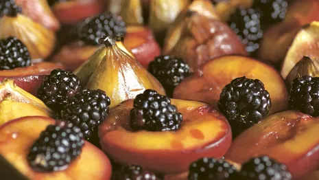 - Stoof het fruit 25-30 minuten in de oven (gebruik je druiven in plaats van bramen? Voeg deze dan 15 minuten voor het eind van de oventijd toe). Het fruit moet zacht en bovenop iets gekaramelliseerd zijn, maar nog wel z’n vorm hebben.