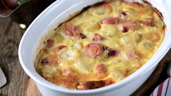 - Schep het boerenkool-roomkaasmengsel over de krieltjes. Verdeel daarover de plakjes rookworst en strooi de geraspte kaas eroverheen.