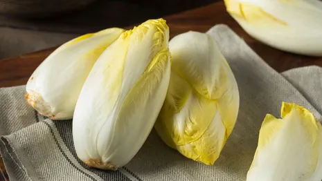 - Halveer de stronken witlof, verwijder de harde kern, en snijd het lof in dunne reepjes. Verwarm de olie in een koekenpan en bak de witlof ongeveer 5 minuten op middelhoog vuur.