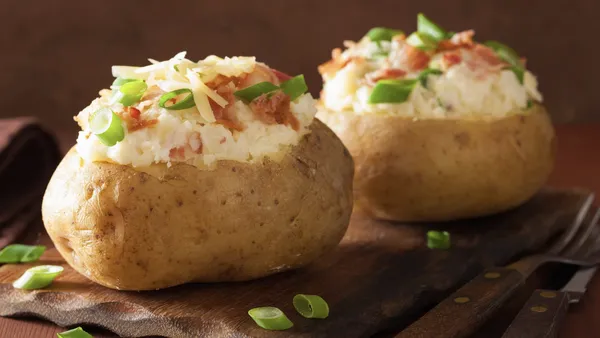 5. Garneer de aardappels naar smaak. Strooi bijvoorbeeld geraspte kaas, gebakken spekjes of krokant gebakken uitjes over de roomvulling.