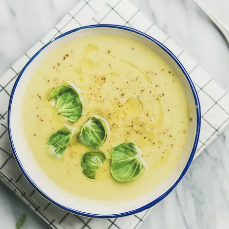 - Pureer de soep met een staafmixer tot een gladde massa, of laat een beetje structuur over als je dat lekkerder vindt. Roer vervolgens de crème fraîche erdoorheen en breng de soep op smaak met peper en zout.