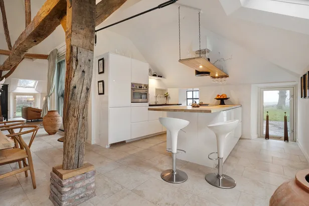 Ook de keuken lijkt rechtstreeks uit het verleden te komen. De muren zijn betegeld met klassieke "witjes" en Delftsblauwe motieven, het plafond heeft robuuste dieprode balken en boven het aanrecht prijkt nog een ouderwetse schouw. Hier waan je je toch 150 jaar terug in de tijd?