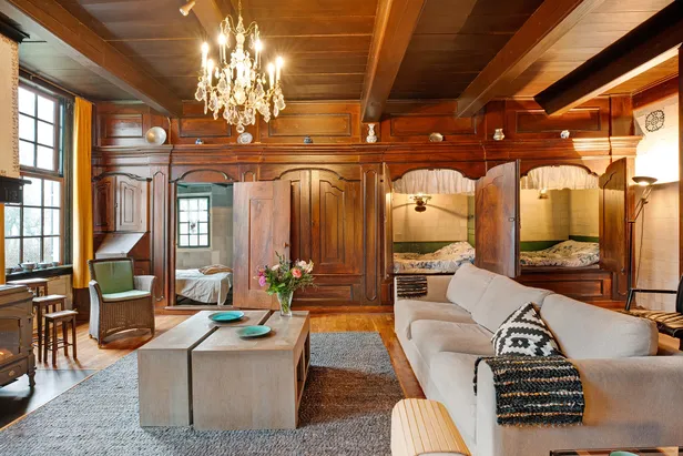 Kom met ons mee naar binnen, want deze boerderij is vanbinnen minstens zo bijzonder als vanbuiten. In de voorkamer trekt meteen het museumwaardige interieur de aandacht, met als kroonstuk een houten bedstedenwand. Wat een knusse en nostalgische bedoeling met al die oude bedstedes op en rij! Wij zien onszelf al zitten in deze historische woonkamer; lekker op de bank, met de kachel aan en een goed boek voor onze neus.