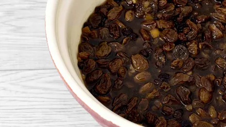 - Haal vervolgens de rozijnen uit de pan en doe deze in de weckpot. Laat de suikersiroop ondertussen op een laag vuur staan zodat deze iets indikt. Roer regelmatig door. Haal vervolgens de citroenschil en de specerijen eruit.