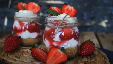 - Snijd de aardbeien in de stukjes en garneer hiermee de glaasjes. Leg ze in een mooi patroon boven op de laag met kwark.