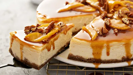 - Rooster de pecannoten licht in een droge koekenpan en hak ze grof. Snijd de overgebleven stroopwafels in stukjes. Haal de cheesecake uit de koelkast en versier hem met stroopwafelstukjes, hazelnoten en tot slot een royale straal karamelsaus.