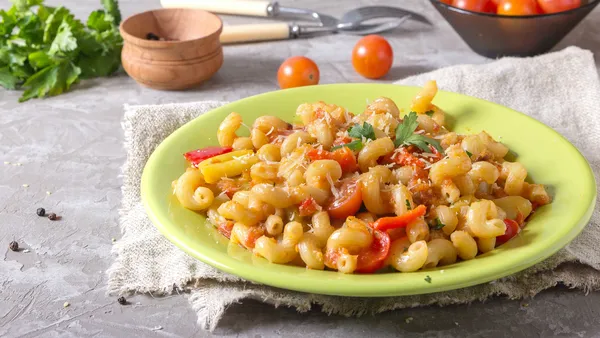 - Snipper de ui en snijd de paprika en smac in blokjes. Halveer de cherrytomaten. Kook ondertussen de macaroni volgens de aanwijzingen op de verpakking en giet af.