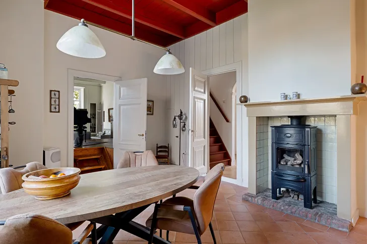 In de eetkamer voelt het alsof hier altijd al is geleefd. Het balkenplafond en de houten wanden geven de ruimte die vertrouwde sfeer van een oude boerenkeuken, zo’n plek waar je op zondag met een groep aan tafel zit en de koffiekan nog een keer wordt doorgeschoven. De schouw en paneeldeuren horen er vanzelfsprekend bij. En dat kleine trappetje achter de eettafel? Als je het openklapt, sta je ineens in de kelder: precies handig voor wie graag een paar goede flessen wijn achter de hand houdt.