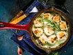 - Klop de eieren los met de crème fraîche, geraspte kaas, nootmuskaat, tijm, peper en zout. Schep de spruitjes en het warme spek-ui-knoflookmengsel door het eimengsel.