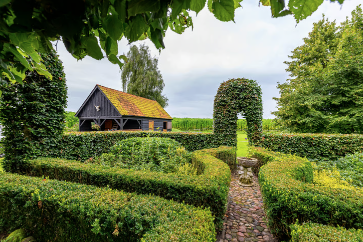 Buiten doet het terrein zeker niet onder voor het huis: de tuin is namelijk enorm – het perceel is maar liefst 5.600 vierkante meter – en is een droom voor iedereen met groene vingers. Je vindt er verschillende zitplekjes en fruitbomen – lekker, zo kun je dus jam en appelmoes maken van je eigen oogst. Voor paardenliefhebbers zijn er zelfs paardenstallen en een bijbehorende paddock.